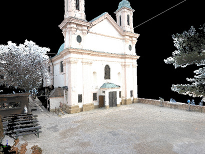 One scanning result showing the church at the Leopoldsberg as textured point cloud. |