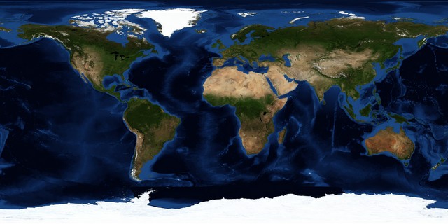 | Die Abbildung zeigt den von uns verwendeten Datensatz topographic & bathymetric shading in der Ausflösung 5400 x 2700, wobei pro Pixel 6 Kilometer Erdoberfläche abgedeckt wird. |