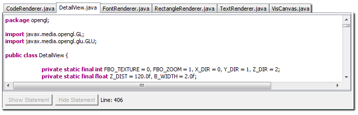 Weiters besteht die Möglichkeit eine einzelne syntaktische Einheit im Editor auszuwählen und diese im Canvas besonders hervorzuheben: Dazu muss der User den Cursor innerhalb der syntaktischen Einheit platzieren. D.h. um beispielsweise eine Klasse auswählen zu lassen, muss sich der Cursor zwischen der ersten und der letzten Zeile der Klasse befinden. Dann genügt ein Klick auf den Button 'Show Statement' und das gewählte Rechteck dieses syntaktischen Konstruktes wird im Canvas mit einem weissen Rahmen umrahmt. Weiters wird die Transparenz von allen anderen Rechtecken verringert. Im Unterschied zum Appearance Panel wird bei dieser Funktionalität nur ein konkretes syntaktisches Konstrukt (beispielsweise eine for-Schleife) visualisert und nicht jedes Auftreten dieses Konstruktes. Durch einen Klick auf den Button 'Hide Statement' bzw. durch das Selektieren einer anderen Datei wird der Modus beendet und alle Rechtecke in der vorhergehenden Form dargestellt. Damit der Benutzer auch im Editor erkennen kann, welche Zeilen zu dem selektierten Konstrukt gehören, wird der Hintergrund dieser Zeilen im Editor türkis eingefärbt. Ein Screenshot für diese Funktionalität kann hier angesehen werden. Kameraeinstellungen:Nachdem eine Datensatz geladen wurde besteht die Möglichkeit, die Blickrichtung zu verändern. Dies erfolgt interaktiv durch Benutzereingaben über Maus und Tastatur oder über den Menüpunkt 'View'.Folgend sind die möglichen Veränderungen der Blickrichtung, die Eingabe über Tastatur und Maus, sowie die äquivalenten Punkte im Menüpunkt 'View':