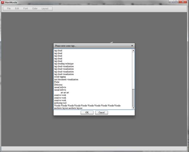 The user interface of the program is intuitive. There is a standard menu, where all basic options for the layout generation can be selected. Tags are manipulated through mouse interaction: left button for select, and after selection for dragging and rotation. The created tag cloud can be saves as screenshot: file -> save.