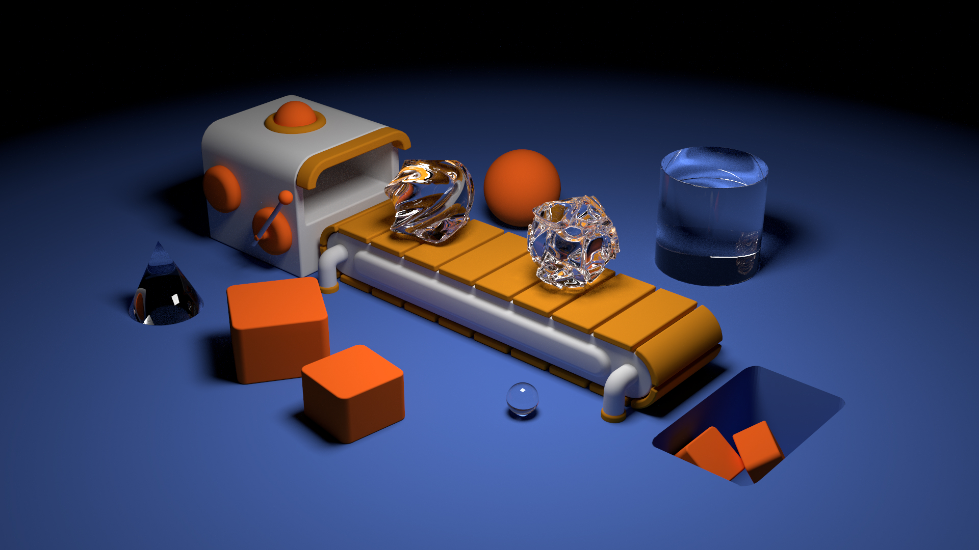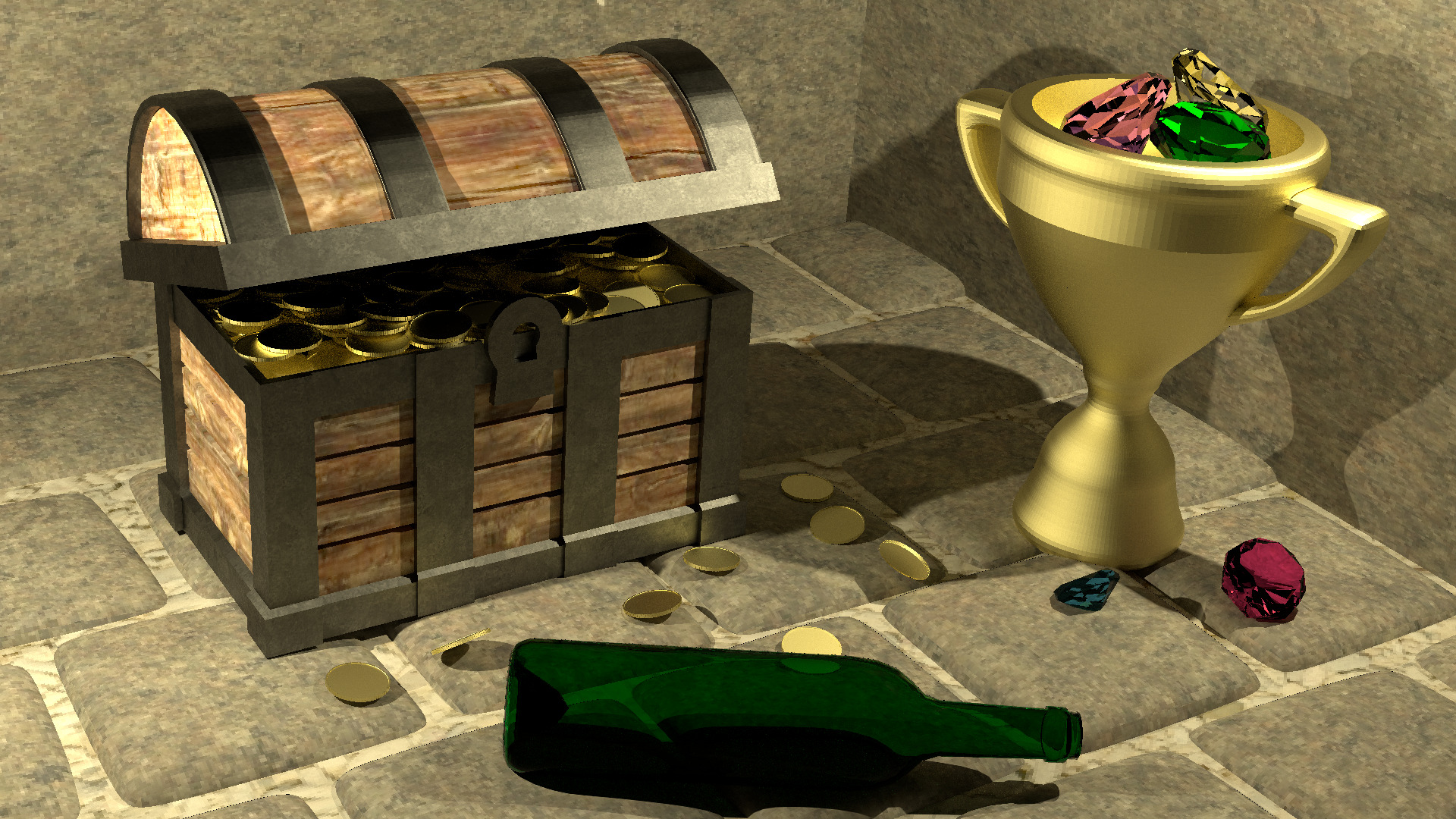 This scene shows a pirate’s hoard with a chest full of coins, scattered gems, and a golden chalice. All elements were modeled in Blender, with physics simulations used to let the coins fall and settle in a natural way. Textures were incorporated to give more detail to the surfaces, and the gold uses a microfacet model with Fresnel reflections and roughness to make it appear more like real metal.