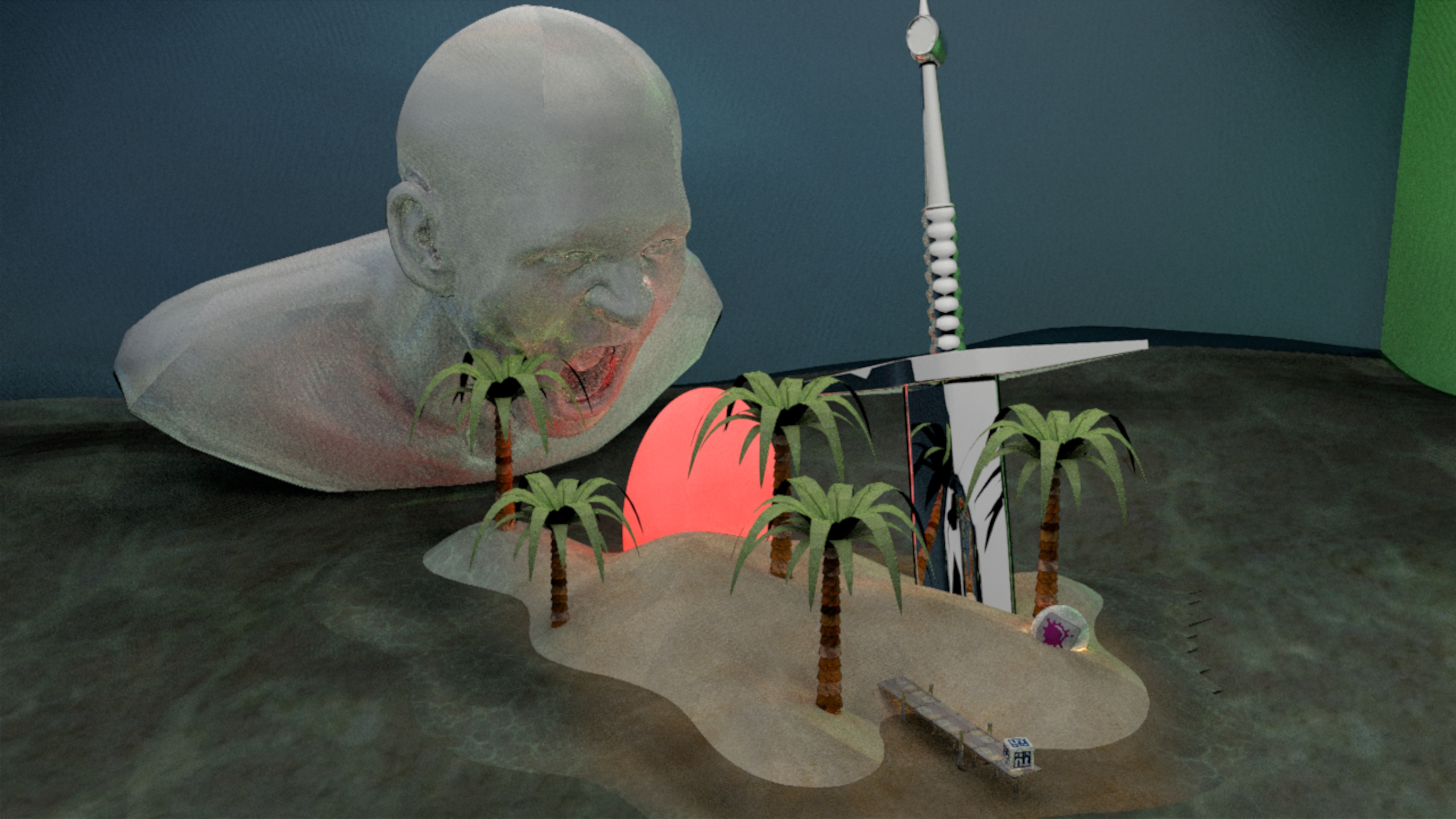 This scene features a beach with palm trees and an island. Additionally, it contains a self modelled boat, a stanford dragon and ammonites. The ammonites have been created using a Structure from Motion approach using 200 images and one of the ammonites uses subsurface scattering for its color.