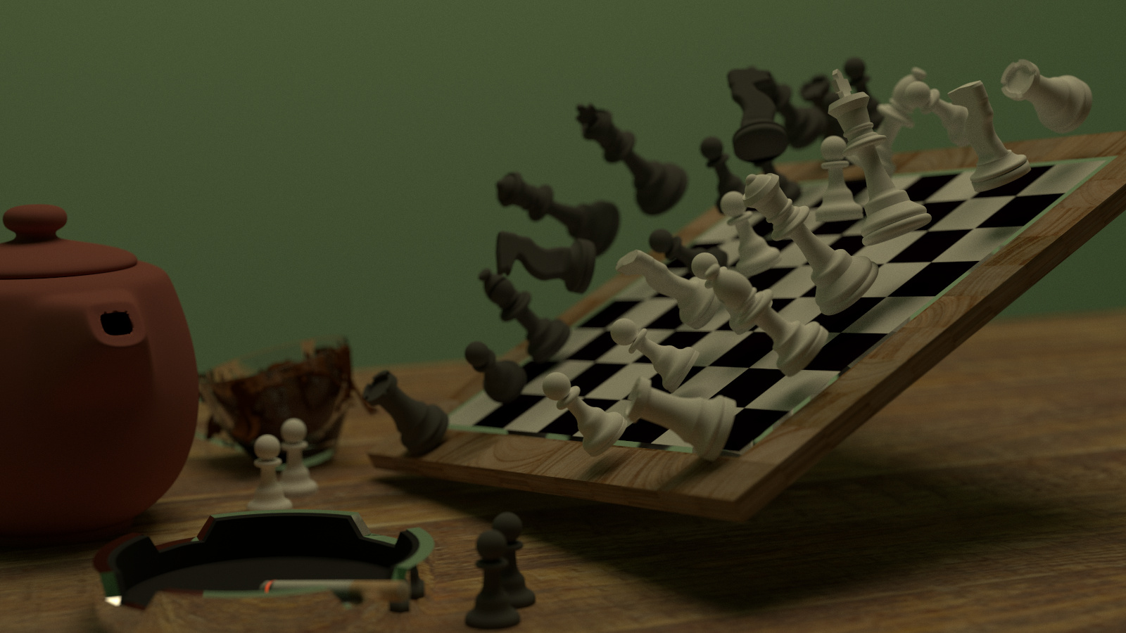 A chessboard is flipped over, sending the pieces flying. A cup tips over in the background. A lit cigarette is resting in an ashtray. The camera focuses on the white queen with a low depth-of-field. The objects use mostly diffuse materials while the board, the ashtray, the cigeratte and the table have textures. Parts of the ashtray and board use mirror materials, while the cup uses a dielectric. The fluid in the cup is a mesh created from a fluid simulation in Blender.