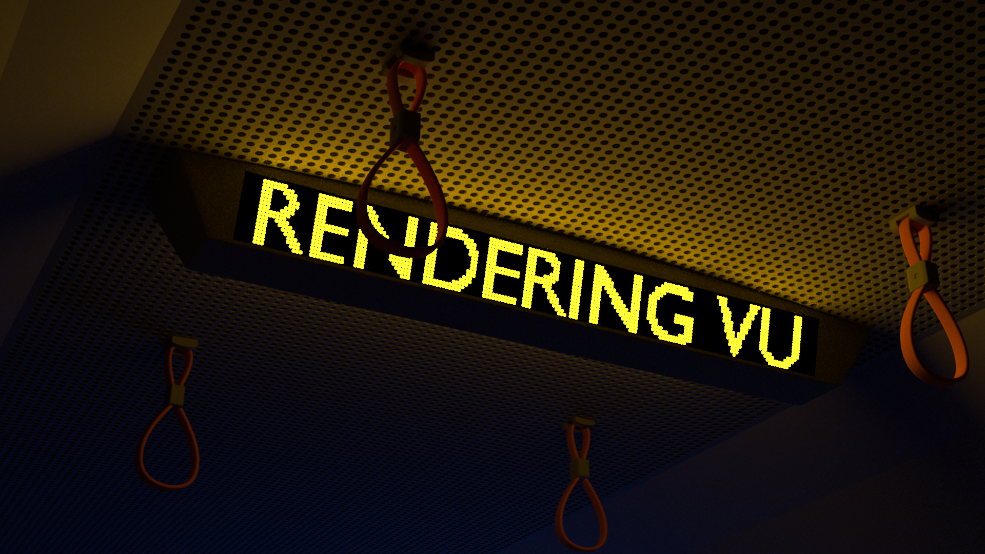 This scene was modeled and arranged using Blender and portrays the perspective of someone sitting in a subway looking up, with the LED panel as a mesh emitter and the moon shining in from outside being the only source of light inside. With countless small features and sharp edges, a Mitchell–Netravali filter helps to smooth out aliasing.