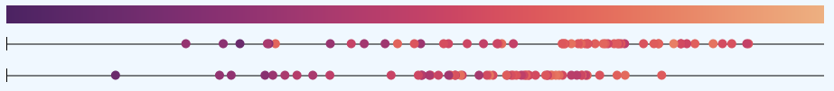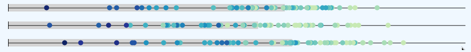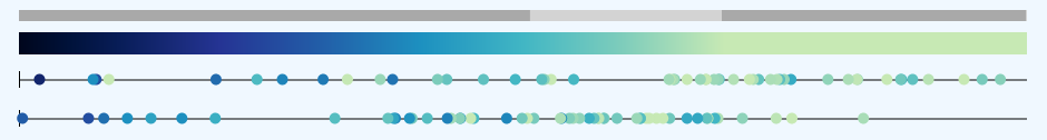 The mousewheel allows to zoom on and out in the main view. While holding down the mouse pointer and dragging the data points can also be moved back and forth on the X-axis. The grey indicator bar above the color scale helps with orientating yourself on the similarity scale. 0 is to the left, 1 to the right. The light grey bar shows the area which is currently in focus.