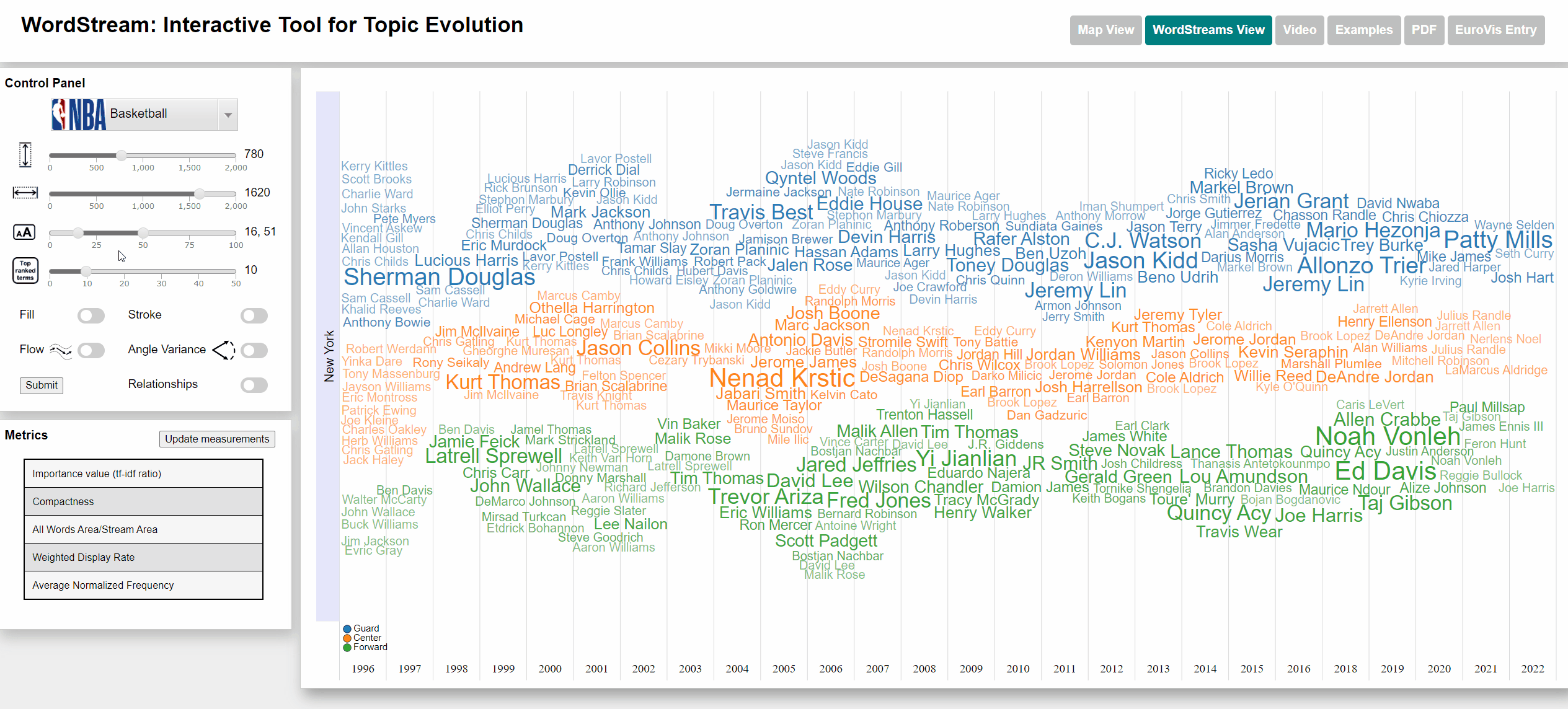 To select states we used an interactive US map. The user can click on up to 4 different states and each WordStream will be generated for those states. We also added a moveable slider at the bottom of the map for the user to select the year for which the most important (sudden attention measure) word will be displayed. The user can also watch an animation going through all years. Each dataset has different categories that are color-coded for better distinction. Each state will be displayed with the category color of the most important word by year. We also added the possibility to view the underlying StreamGraph of the WordStream. In the WordStreams View, the user can change the fill and stroke parameters on the left control panel.