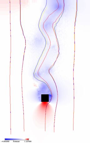 The second technique visualizes the dataset by using so called stream lines. There are several ways how to generate streamlines. Two of them are implemented in the software: Euler and Runge-Kutta integration. The two procedures mainly differs in the precision of the result. A very useful feature is to automatic create evenly spaced streamlines. This provides a very good impression of the flow around an object. More details to this technique can be found at http://www-lil.univ-littoral.fr/~lefer/papers/Springer97.abstract.html.