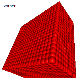 Zum jetztigen Zeitpunkt sehen alle Glyphen gleich aus, da die Superellipsoid-Parameter (Länglichkeit, Gestalt) standardmäßig immer auf xs = 1.0 (isotrop) und exp = 2.0 (kugelförmig) gesetzt werden. In dieser und den nächsten beiden Aufgabe sollen nun die Superellipsoid-Parameter entsprechend den Gradientenwerten gesetzt werden.