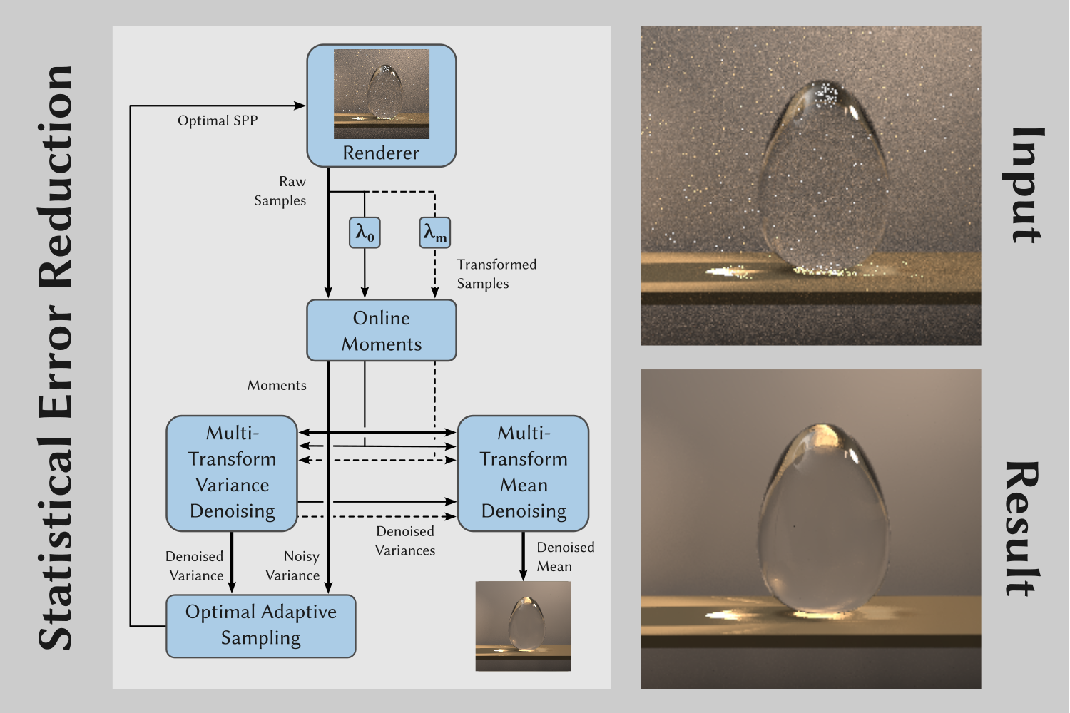 In summary, our statistics-based algorithms for adaptive sampling and denoising deliver fast, consistent, low-bias variance and radiance estimates.