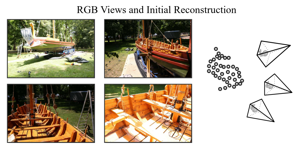 - project the RGB images onto this scaffold and optimize fine in-between geometry for a common view with images from the other view points using gradient descent (inspired by 3D Gaussian splats but without learning)