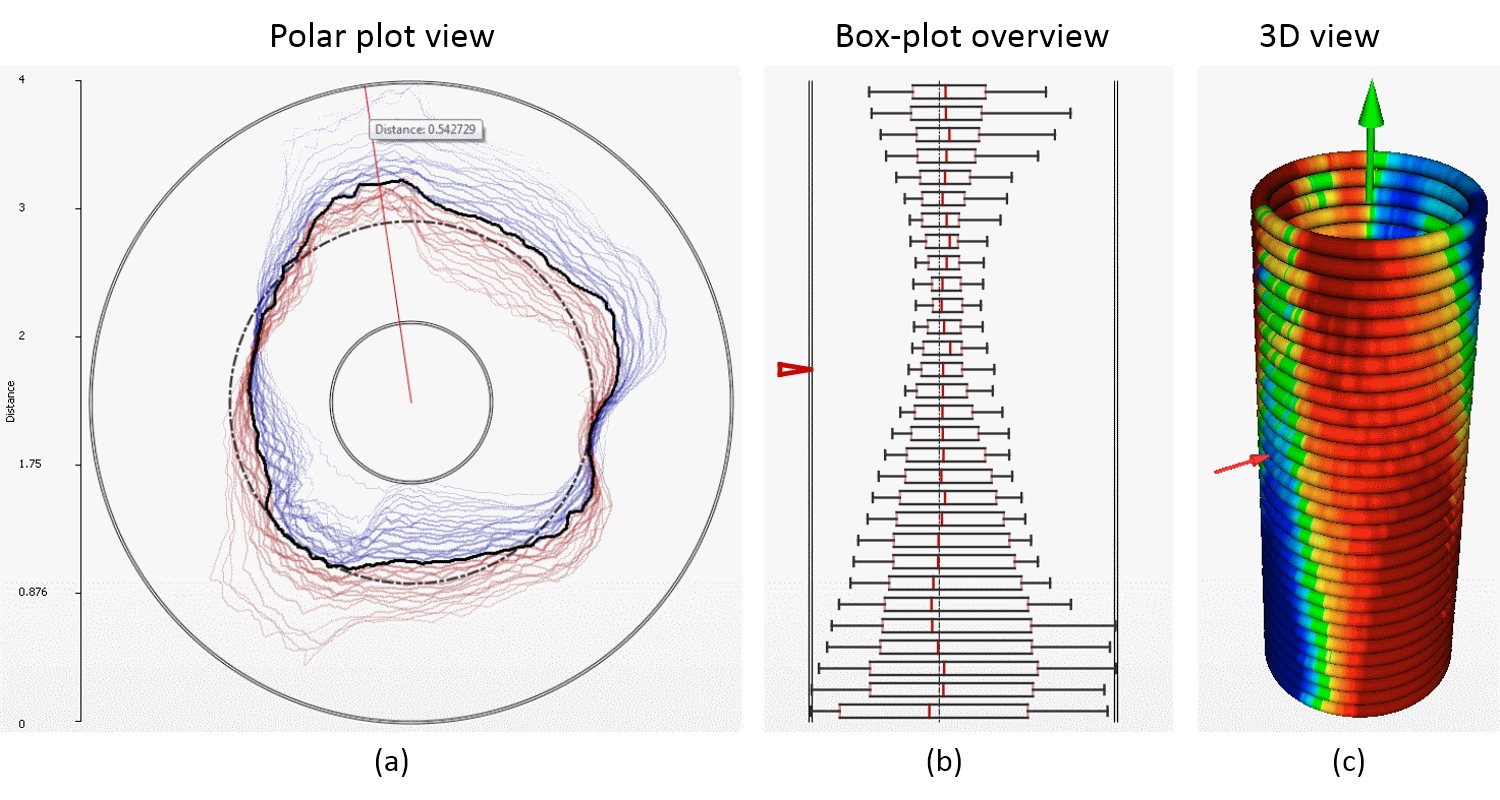 Industrial 3D X-ray computed tomography (3DXCT) is increasingly applied as a technique for metrology applications. In contrast to comventional metrology tools such as coordinate measurement machines (CMMs). 3DXCT only estimates the exact position of the specimen’s surface and is subjected to a specific set of artifact types. These factors result in uncertainty that is present in the data. Previous work by Amirkhanov et. al [2] presented a tool prototype that is taking such uncertainty into account when measuring geometric tolerances such as straightness, circularity, or flatness. In this paper we extend the previous work with two more geometric tolerance types: cylindricity and angularity. We provide methods and tools for visualization, inspection, and analysis of these tolerances. For the cylindricity tolerance we employ neighboring profiles visualization, box-plot overview, and interactive 3D view. We evaluate applicability and usefulness our methods on a new TP03 data set, and present results and new potential use cases.Additional Files and Images