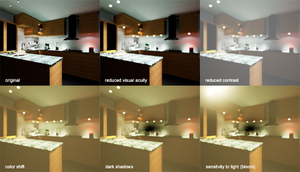 1.3 billion people worldwide are affected by vision impairments, according to the World Health Organization. However, vision impairments are hardly ever taken into account when we design our cities, buildings, emergency signposting, or lighting systems. With this research, we want to develop realistic, medically based simulations of eye diseases in VR and AR, which allow calibrating vision impairments to the same level for different users. This allows us to conduct user studies with participants with normal sight and graphically simulated vision impairments, to determine the effects of these impairments on perception, and to investigate lighting concepts under impaired vision conditions. This thesis will, for the first time, provide methods for architects and designers to evaluate their designs for accessibility and to develop lighting systems that can enhance the perception of people with vision impairments.Additional Files and Images