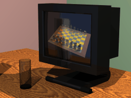 Ray TracingThe last scene with the black monitor contains some diffuse reflection on the screen. This scene was very time consuming to calculate, since ray tracing is not very well suited for calculating diffuse reflections.