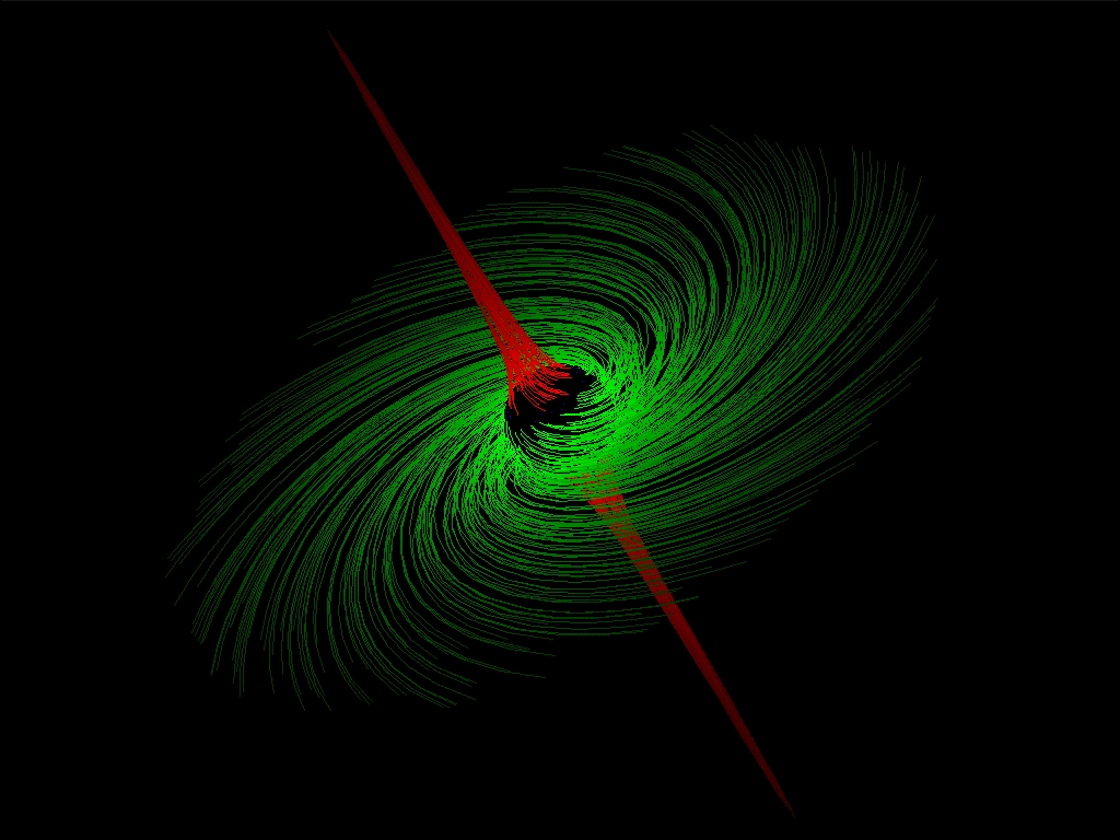 [plate 7] Plate 7 is again a visualization of a fixed point of a linear dynamical system using streamlines starting on a sphere around the fixed point. Red streamlines are integrated backwards and the green ones forwards, therefore it is easy to see where the flow comes from and where it goes in the vicinity of the fixed point.