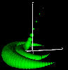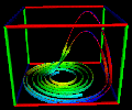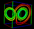 The local stability of chaotic dynamical systems is especially interesting as it desribes the limited predictability of such systems. Lyapunov exponents (an n-dimensional system does have n Lyapunov exponents) which are due to a local linearization of the system correspond to converging and diverging behavior of nearby trajectories. We investigated some methods for visualizing Lyapunov exponents. The magnitude of Lyapunove exponents may be encoded in the size of spheres positioned along a trajectory. Positive Lyapunov exponents describe diverging behavior (image with red spheres), negative Lyapunov exponents describe converging behavior (image with green spheres). The evolvment of adjacent trajectories describes the local dynamics as well (see both images to the right). Further information is given in the technical report Visualization of Local Stability of Dynamical Systems